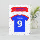 Esta estrellada invitación a la fiesta de cumpleaños 9, genial para niños y chicas, está lista para tu texto personalizado. El mensaje en el gran cartel de cumpleaños rojo es "Ven a mi fiesta de cumpleaños número 9". Delante de la tarjeta hay una camisa de estilo deportivo roja y azul, con un gran número blanco 9 y un espacio para un nombre. En el reverso de la tarjeta puede introducir los detalles del fiesta.