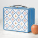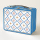 A blue metal lunchbox features a geometric tile