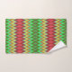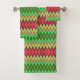 A colorful, geometric-patterned towel set hangs on a rod. The zigzag design features vibrant green, red, and yellow hues, creating a lively, dynamic appearance.