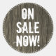 Este diseño de venta de pegatinas redondeados incluye el mensaje "ON SALE NOW!". También tiene un aspecto de madera falsa. Se podría usar en una tienda minorista para marcar mercancías que han reducido su precio.