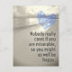 "A nadie le importa realmente si eres miserable, así que también podrías ser feliz". Postal. Una simple cita inspiradora a veces es el mejor y memorable regalo para nuestros seres queridos.