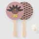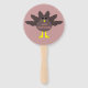 Este impresionante ventilador de mano tiene un personalizado de pavo con grandes ojos negros, un pequeño pico amarillo y plumas de cola pegadas. Los pies están en direcciones opuestas, lo que hace que el pavo parezca ridículo. El pavo tiene un texto rosado en el vientre que dice "Feliz Día de Acción de Gracias" y parece que las plumas han sido arrancadas para revelar el mensaje.