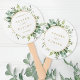 Este ventilador de mano boda está decorado con eucalipto pintado de color agua, hojas verdes con un marco redondo dorado. Para una personalización más avanzada de este diseño, haga clic en el enlace "Personalizar más adelante". También están disponibles los elementos coincidentes.