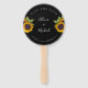 Una boda rústica de estilo tradicional salva el ventilador de fecha oscuro redondo con un hermoso borde de girasol sobre un sólido fondo negro. +++++++ Ideal para su verano o otoño, elegante jardín floral al aire libre, granero o bodas con temas de patio trasero. ¡Personalízalo con los nombres de la novia y del novio y los detalles del boda en ambos lados!
