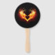 Ángel dispara el corazón con las alas flameantes sobre fondo negro.