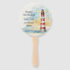 Este abanico de mano redondo presenta una serena ilustración en acuarela de un clásico faro de rayas rojas y blancas que se mantiene firme contra un suave fondo costero. El diseño muestra suaves olas azules, un barco velero distante y aves volando, creando una atmósfera costera pacífica que atrae a cualquier amante del océano. Un sentido mensaje de cumpleaños está impreso en una fuente naval limpia, complementado por un faro amarillo brillante que simboliza un año brillante por delante. Perfecto para fiestas de verano al aire libre, celebraciones en la playa o reuniones con tema náutico, este accesorio combina el enfriamiento funcional con una estética marítima atemporal que cualquiera puede apreciar.