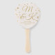Un delicado abanico de mano de boda de color rosa palo con confeti de oro y espacio para tus iniciales y quizás tu orden de servicio en el reverso.