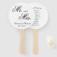 Elegante Programa de Bodas Mano Ventilador con las palabras "Sr. y Sra." junto con sus nombres y fecha boda en una hermosa caligrafía negra en un fondo blanco en el frente. La parte trasera tiene ceremonias. Estos elegantes ventiladores de mano Boda le proporcionarán a sus huéspedes el orden del servicio y son perfectos para un boda de corbata negra al aire libre o para la recepción.