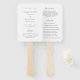 Abanico de mano de programa de boda tradicional con un diseño simple con sus nombres en una escritura elegante y los detalles de su evento en una fuente clásica serif.