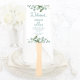 Este fan del programa con eucaluptus verde salado es una excelente manera de dar la bienvenida a sus huéspedes y mantenerlos frescos cuando hace buen tiempo. La parte delantera les agradece por venir. El otro lado muestra los detalles de tu ceremonia y tu fiesta de boda. Todos los campos se pueden personalizar según sus especificaciones