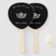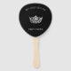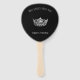 Este abanico se muestra en negro con una impresión de una corona estilo Miss América de color plateado y un texto de muestra para que usted pueda personalizar a su gusto. Elija entre diferentes formas, etc.