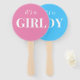 Los fanáticos de las manos azul y rosa para una ducha de bebé o de un sexo revelan fiesta. Cada uno de ellos tiene un doble lado y un lado dice "es un chica" y el otro dice "es un niño". Edite el texto o los colores haciendo clic en el botón para editar la plantilla.