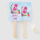 Un ventilador personalizado de mano con un bonito ilustracion de un flamingo rosa con algunas sandías y piñas. Color rosa y verde. Summery y tropical. El fondo es una imagen de color azul claro. Perfecto para una fiesta de cumpleaños al aire libre en el caluroso verano.
