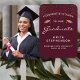 Ayude a sus invitados a mantenerse frescos durante la ceremonia o fiesta con estos fans de la mano de la graduación de fotos personalizados, con las palabras "Felicitaciones a nuestro graduado" en texto blanco con un fondo borgoñoso. La palabra "Graduado" aparece en un guión elegante estilo escritura a mano. Un par de gorras de tablero de mortero purpurina de imitación dorada y una dispersión de confeti dorado decoran la parte superior de la etiqueta. Personalice un lado con el nombre, la escuela y el año de graduación de su graduado. Reemplace fácilmente la imagen de ejemplo del otro lado con una foto de su graduación.