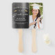 Ayude a sus invitados a mantenerse frescos durante la ceremonia o fiesta con estos fans de la mano de la graduación fotográfica personalizado, que incluyen las palabras "Felicitaciones a nuestro graduado" en texto blanco sobre un fondo metalizado color gris carbón. La palabra "Graduado" aparece en un guión elegante estilo escritura a mano. Un par de gorras de tablero de mortero purpurina de imitación dorada y una dispersión de confeti dorado decoran la parte superior de la etiqueta. Personalice un lado con el nombre, la escuela y el año de graduación de su graduado. Reemplace fácilmente la imagen de ejemplo del otro lado con una foto de su graduación.