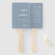 Estos elegantes y minimalistas aficionados al programa de bodas presentan una tipografía de escritura moderna en blanco y un texto limpio y sans serif para un diseño azul polvoriento y sencillo que le encantará. La parte posterior del ventilador contiene su orden de ceremonia u otra información de su elección.