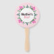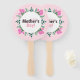 Happy Mother's day hand fan decorated with pink tulips, white tiny flowers and green leaves.