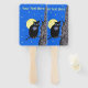 Este fanático de la mano del programa tiene un búho nocturno negro con ojos azules sentados en una rama en un árbol negro en un cielo oscuro azul nocturno con luna amarilla llena y estrellas en el frente y en la espalda. Personalizar el texto con la plantilla.