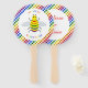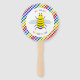 Este impresionante ventilador de mano boda presenta una imagen de diseño gráfico de color arcoiris de una abeja. La abeja tiene un cuerpo amarillo con ojos negros, piernas y antenas y 5 rayas en su vientre, una en rojo, naranja, verde, azul y púrpura. Hay un texto de color arcoiris alrededor de la abeja que dice "Sé orgulloso de ser el que eres" También hay una selección de flores de color arcoiris en el fondo. Hay un texto personalizado detrás para incluir el nombre de la pareja feliz.