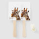 El número de la subasta con temática zoológica se paddle y el ventilador se hacen en blanco con una fotografía de la cabeza de una jirafa. Personalice el texto en castaño para su evento. Escribir a mano en el número de cada paleta, en la parte superior.