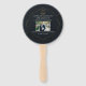 Este fanático de la mano del partido de graduación de la escuela de derecho personalizado de moda presenta un diseño hexagonal geométrico de oro con escalas de justicia colocadas encima de una foto del graduado. Diseño fotográfico moderno y elegante para un nuevo abogado graduado en la clase de 2024.