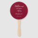 Programa del día de la boda impreso en un ventilador de estilo redondo que presenta un fondo de color rojo de arándano a la moda en la parte delantera con los nombres de novias y novios en escritura blanca y estilizada. En la parte posterior del programa se enumeran los participantes de la fiesta de boda y los ritos de ceremonia sobre un fondo blanco con letras grises oscuras. Edite el ventilador de la mano y reemplace la información del programa de bodas con la suya. ¡Ideal para una ceremonia de boda en el interior o al aire libre! Seleccione el número de programas de ventilador manual que desee.