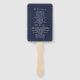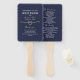 Moderno, minimalista, elegante, sencillo guión de caligrafía programa de bodas azul marino, fanáticos de la mano con corazón de cuerda dorada.