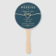 Sencillo y elegante programa de bodas azul marino, fanáticos de la mano con corazón de cuerda dorada y escritura moderna.