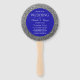 Simple, elegante, lujoso abanico de mano para programa de boda plateado con brillo y azul real con escritura de caligrafía moderna.