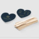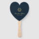 Un elegante abanico de programa de boda en forma de corazón para un tema de boda azul marino y dorado. Los títulos y los nombres (y las iniciales) de la novia y el novio están escritos en una elegante letra caligráfica, el resto en mayúsculas. El fondo es azul marino, el texto es amarillo dorado. En la parte delantera, encima del texto, hay un monograma en una guirnalda de hojas doradas vintage. En la parte posterior, tiene en el lado izquierdo el programa de la ceremonia de boda y, en el lado derecho, el séquito de boda (con 2 columnas diferentes para el equipo de la novia y el equipo del novio). y debajo de ellos un breve mensaje de agradecimiento.