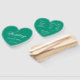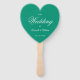 Un simple pero elegante fan del programa de bodas en forma de corazón con un color verde esmeralda moderno. Los títulos y nombres (y las iniciales) de la novia y el novio están escritos en un elegante guión caligráfico, el resto en mayúsculas. El texto es blanco. En la parte trasera, tiene a la izquierda el programa de ceremonia de boda y, en el lado derecho, la fiesta de boda (con dos columnas diferentes para el equipo de novias y el equipo de novios). Y debajo de ellas un breve mensaje de agradecimiento.