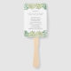 Abanicos de mano para programa de boda botánico con un borde superior e inferior que consiste en suculentas de acuarela verde en la parte delantera y un borde superior en la parte posterior. Sus detalles están en una fuente gris suave. Agregue los eventos de su ceremonia en la parte delantera y su séquito de boda y un mensaje de agradecimiento opcional en la parte posterior. Estos abanicos de mano ayudarán a mantener frescos a sus invitados durante una boda al aire libre y les proporcionarán el orden del servicio. También hacen un gran recuerdo y son perfectos para una boda en el desierto en primavera o verano.