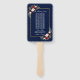 Elegante Fan del Programa de Boda con Marco Dorado Floral de color Azul Borgoña incluye rosas burdeos, rosas rosas rosas, flores rojas, flores azules y vegetación botánica. Fondo azul marino.