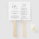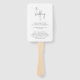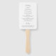 Elegante abanico de mano para programa de boda con un diseño simple que incluye "la boda de" en una tipografía manuscrita moderna y los detalles de su evento en fuentes serif clásicas.