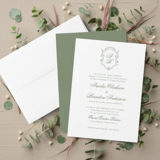 Deep Sage Green Botanical Monogram Crest WeddingDiseñado por Jessica Senarlo
