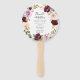 Abanico de mano de programa de boda floral elegante con los detalles de su boda rodeados por una corona de rosas y vegetación en acuarela en tonos de rosa, melocotón, borgoña, púrpura y verde. Personalice los abanicos del programa de boda floral agregando la fecha y ubicación de su boda, orden de eventos y grupo de boda en la parte posterior. Diseñado para coordinar con nuestra colección de boda Rustic Moody Floral.
