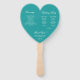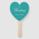 Un simple pero elegante fan del programa de bodas en forma de corazón para un verde azulado color azul boda. Los títulos y nombres (y las iniciales) de la novia y el novio están escritos en un elegante guión caligráfico, el resto en mayúsculas. El fondo está verde azulado, el texto es blanco. En la parte trasera, tiene a la izquierda el programa de ceremonia de boda y, en el lado derecho, la fiesta de boda (con dos columnas diferentes para el equipo de novias y el equipo de novios). Y debajo de ellas un breve mensaje de agradecimiento.