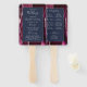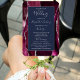 Este elegante y moderno fan del programa de bodas cuenta con un fondo de ágata borgoña adornado con un falso purpurina plateado. El texto aparece en letra gris plateada y fuentes de copperplate en un rectángulo azul marino.