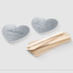 Un simple pero elegante fan del programa de bodas en forma de corazón. Los títulos y nombres (y las iniciales) de la novia y el novio están escritos en un elegante guión caligráfico, el resto en mayúsculas. El fondo es falso plateado (un gris metálico), el texto es gris oscuro. En la parte trasera, tiene a la izquierda el programa de ceremonia de boda y, en el lado derecho, la fiesta de boda (con dos columnas diferentes para el equipo de novias y el equipo de novios). Y debajo de ellas un breve mensaje de agradecimiento.