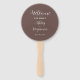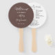 Programa del día de la boda impreso en un ventilador de estilo redondo que presenta un fondo de color de moda en la parte delantera con los nombres de novias y novios en escritura blanca y estilizada. En la parte posterior del programa se enumeran los participantes de la fiesta de boda y los ritos de ceremonia sobre un fondo blanco con letras grises oscuras. Edite el ventilador de la mano y reemplace la información del programa de bodas con la suya. ¡Ideal para una ceremonia de boda en el interior o al aire libre! Seleccione el número de programas de ventilador manual que desee.