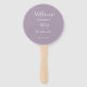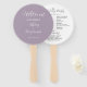 Programa del día de la boda impreso en un ventilador de estilo redondo que presenta un fondo de color moderno y malva en la parte delantera con los nombres de novias y novios en escritura blanca y estilizada. En la parte posterior del programa se enumeran los participantes de la fiesta de boda y los ritos de ceremonia sobre un fondo blanco con letras grises oscuras. Edite el ventilador de la mano y reemplace la información del programa de bodas con la suya. ¡Ideal para una ceremonia de boda en el interior o al aire libre! Seleccione el número de programas de ventilador manual que desee.