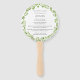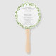 Afan del programa de bodas rústicas con sus detalles dentro de una corona compuesta de hojas de oliva verdes. Sus detalles están en un tipo de letra gris medio. La parte delantera tiene tus eventos de ceremonia y la parte trasera tiene tu fiesta de boda. Los ventiladores de mano son perfectos para un boda al aire libre en verano.