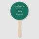 Programa de día de boda impreso en un abanico de mano de estilo redondo que presenta un fondo de color verde esmeralda de moda en el lado frontal con los nombres de los novios en escritura estilizada blanca. El lado posterior del programa enumera los participantes de la fiesta de bodas y los ritos de la ceremonia en un fondo blanco con letras gris oscuro. Edite el abanico de mano y reemplace la información del programa de boda con la suya. ¡Perfecto para una ceremonia de boda interior o al aire libre! Seleccione el número de programas de abanico de mano deseado.
