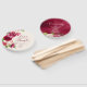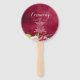 Una florida y brillante multitud de rosas en tonos burdeos y crema es el punto fuerte de muchas de las piezas de esta suite boda que también cuenta con un elegante guión de texto y un diseño moderno. El ventilador de mano boda que se muestra aquí tiene un borde lateral de rosas y un hermoso resumen de acuarela al revés en rico borgoña y ciruela. Introduzca fácilmente los detalles de su mensaje personal y de la ceremonia del boda utilizando la plantilla proporcionada. Busque ID584 para ver todas las piezas coincidentes en este hermoso conjunto de bodas.