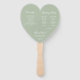 Un simple pero elegante fan del programa de boda en forma de corazón para un color boda verde sabio. Los títulos y nombres (y las iniciales) de la novia y el novio están escritos en un elegante guión caligráfico, el resto en mayúsculas. El fondo es verde salvia, el texto es blanco. En la parte trasera, tiene a la izquierda el programa de ceremonia de boda y, en el lado derecho, la fiesta de boda (con dos columnas diferentes para el equipo de novias y el equipo de novios). Y debajo de ellas un breve mensaje de agradecimiento.