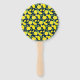 Ventilador de mano con un paraguas blanco que está esparciendo limones sonrientes y hojas verdes sobre un fondo azul. La parte de atrás muestra un patrón de limones sonrientes con hojas verdes también en un fondo azul.
