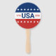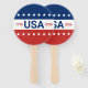 Celebrating the USA's 250th anniversary. This red, white, and blue hand fan has the word 'USA' in the center. The years 1776 and 2026 are next to USA. The top stripe is blue and has white stars. The center stripe is white. The bottom stripe is red with white stars.