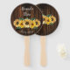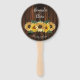 Personalice un exclusivo favor de boda para los invitados con un conjunto de fans de la boda rustica de la mano favorita de la boda del girasol. El diseño del ventilador de mano presenta un fondo rústico de madera con un elegante ramo de girasoles. Personaliza con los nombres del novio y la novia junto con la fecha del boda. También hay material de boda adicional disponible con este diseño.