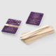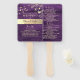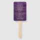 Elegante, moderno y rústico programa de bodas de púrpura en madera granada, abanicos con encaje floral dorado, luces de cuerdas y guión moderno de caligrafía.