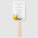Programa de ventilador rectangular con un diseño de flores de ave del paraíso. Elija papel blanco o en color crudo para personalizar con texto delante y atrás. Los fans estarán pegados después de la compra, o usted puede pagar extra para tenerlos preensamblados. El texto es morado oscuro con una sola imagen de flor tropical amarilla en la parte inferior delantera.
